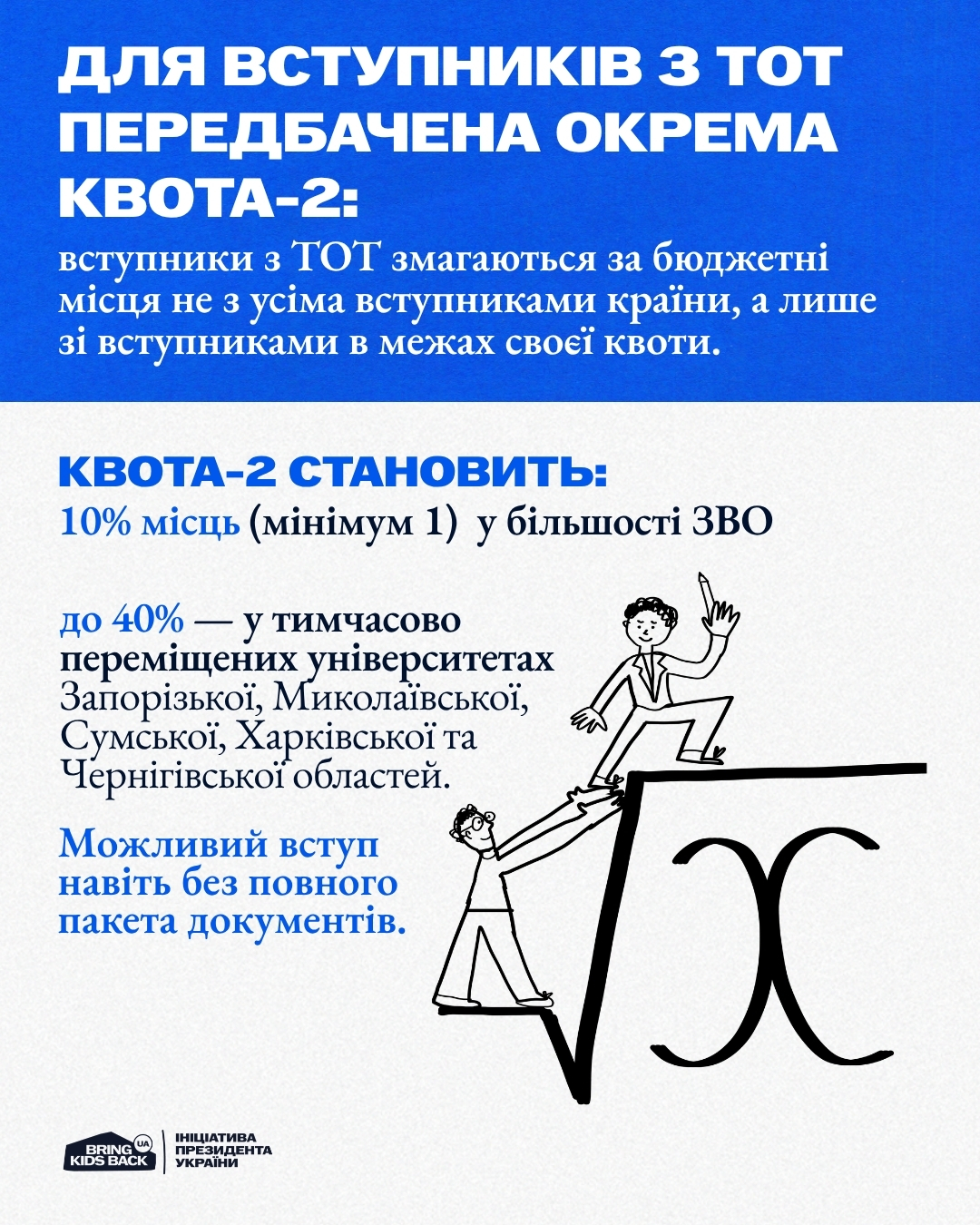 Квота-2 передбачає окремий конкурс на бюджетні місця: у ньому беруть участь вступники з ТОТ та територій активних бойових дій. У більшості університетів це 10% місць (але не менше одного), а в переміщених ЗВО — до 40%.