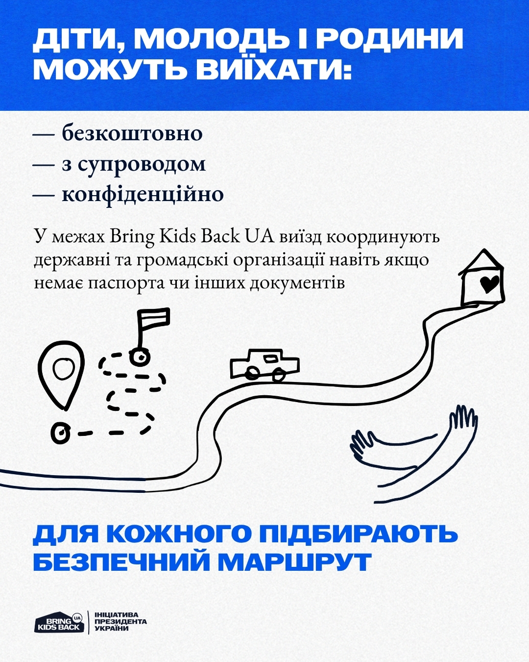 Якщо ви тільки плануєте виїзд — звертайтеся. У межах ініціативи Bring Kids Back UA допомагають виїхати безкоштовно, конфіденційно та з повним супроводом — навіть якщо немає документів. Для кожного підбирають безпечний маршрут.
